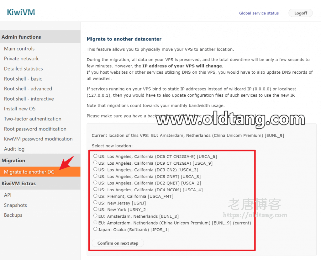 首先我们进入搬瓦工 KiwiVM 控制面板,之后在左侧菜单可以看到 Migrate to another DC 的选项,如图所示。