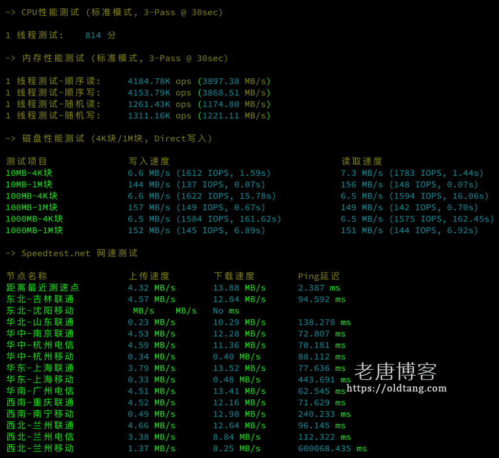 阿里云国际版前阵子进行了改版,上线了全新的新手方案。老唐忍到现在终于也还是买了一台,下面拿出来测试一下看看性能怎么样。老唐买的是 $7.5/月的,配置大概是 1 核 CPU,2GB 内存,50GB 硬盘,这样子,带宽是 30Mbps,流量记不清了。