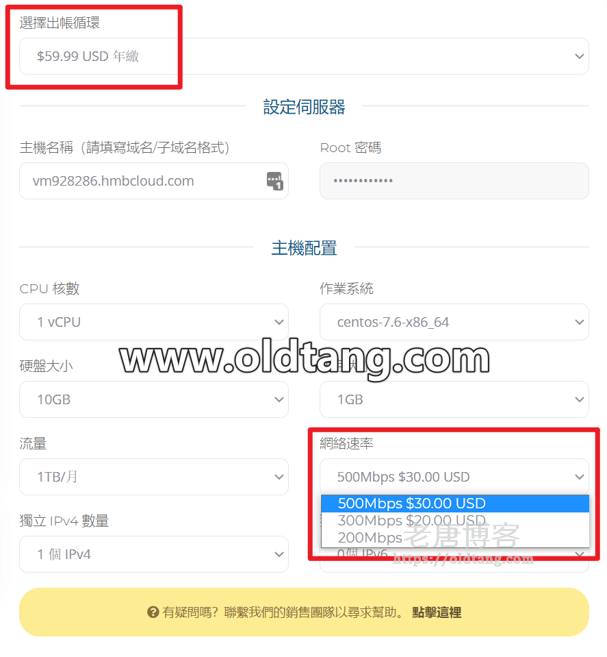 点击上面的购买链接之后,默认是 $89.99/年的 500Mbps 套餐,根据下面截图选择一下网络速率,即可改成 $59.99/年 200M 的 CN2 GIA 套餐。