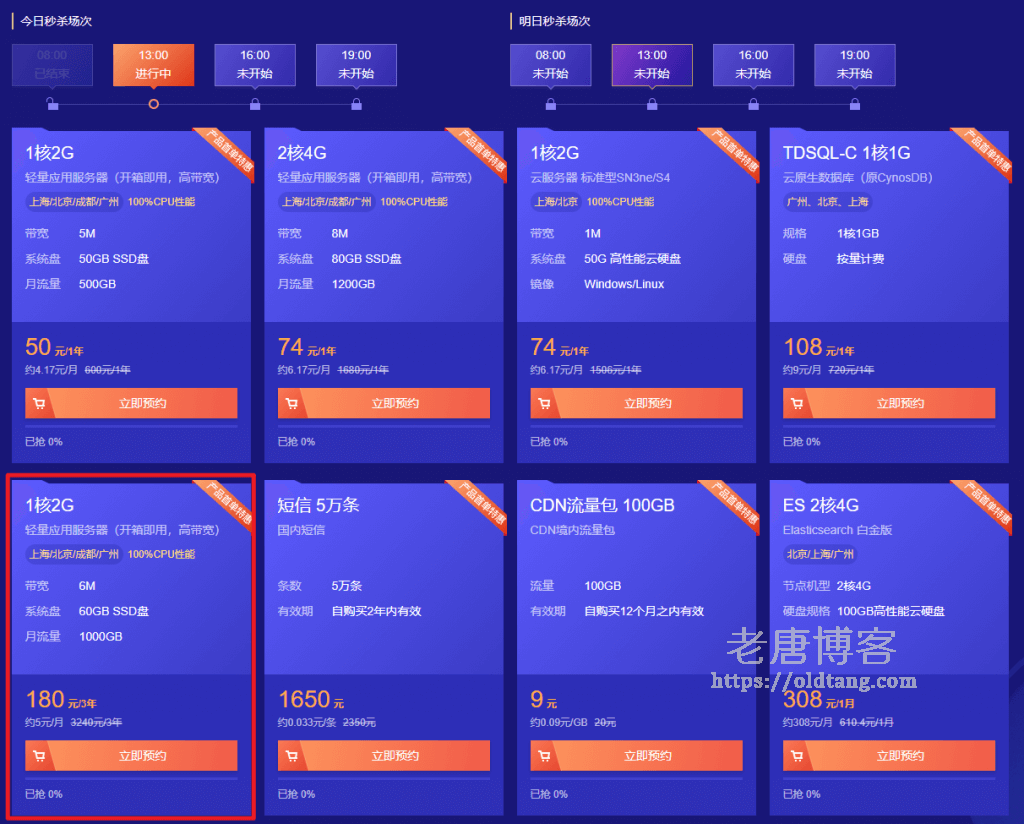 如图所示,可以看到这个 180 元/3年的套餐并不是每个秒杀时段都有,我们可以关注一下,目前看到下次有是在明天下午 1 点的场次。