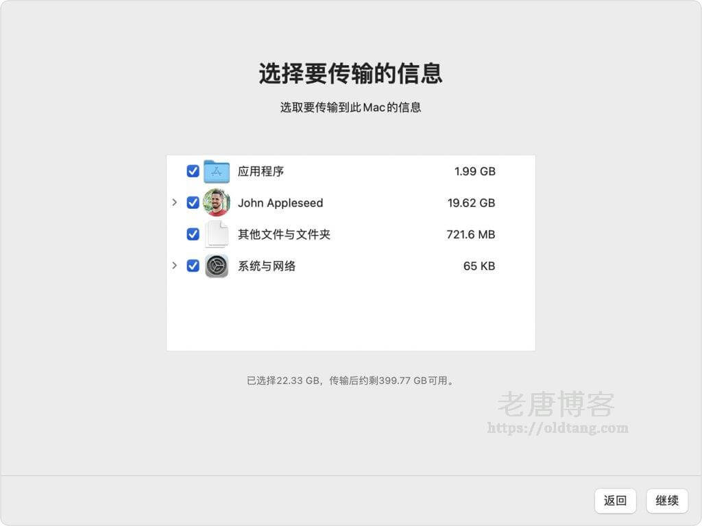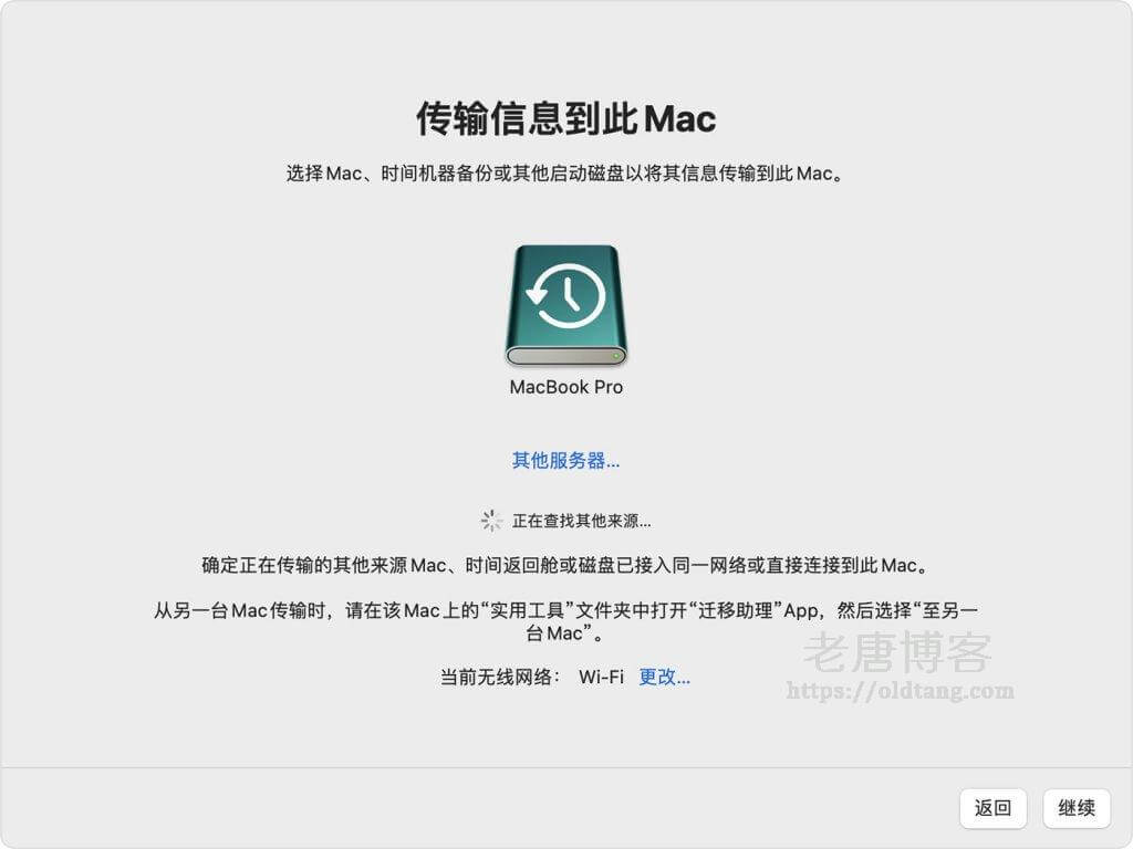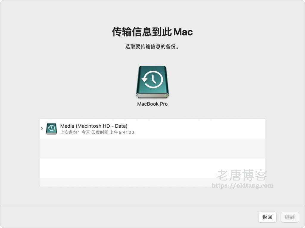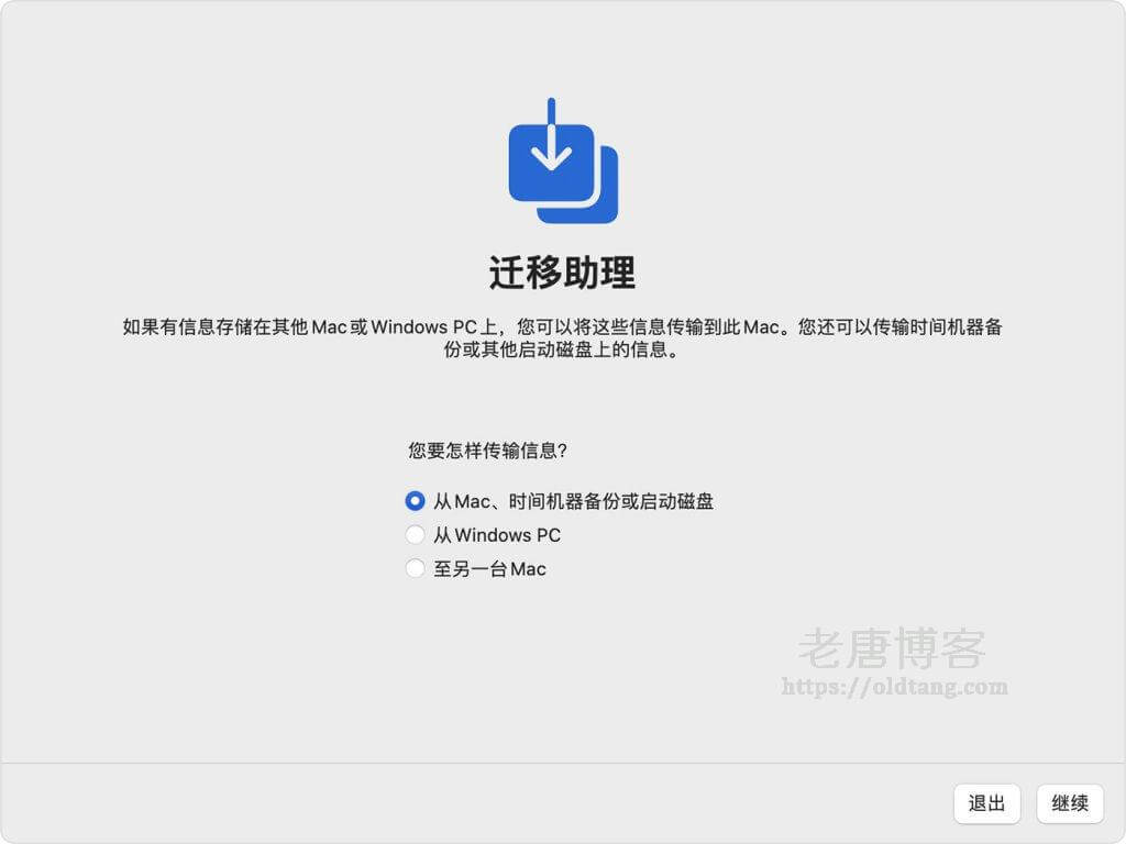 4、当系统询问您要怎样传输信息时,请选择从 Mac、“时间机器”备份或启动磁盘进行传输的方式。然后,点按“继续”。