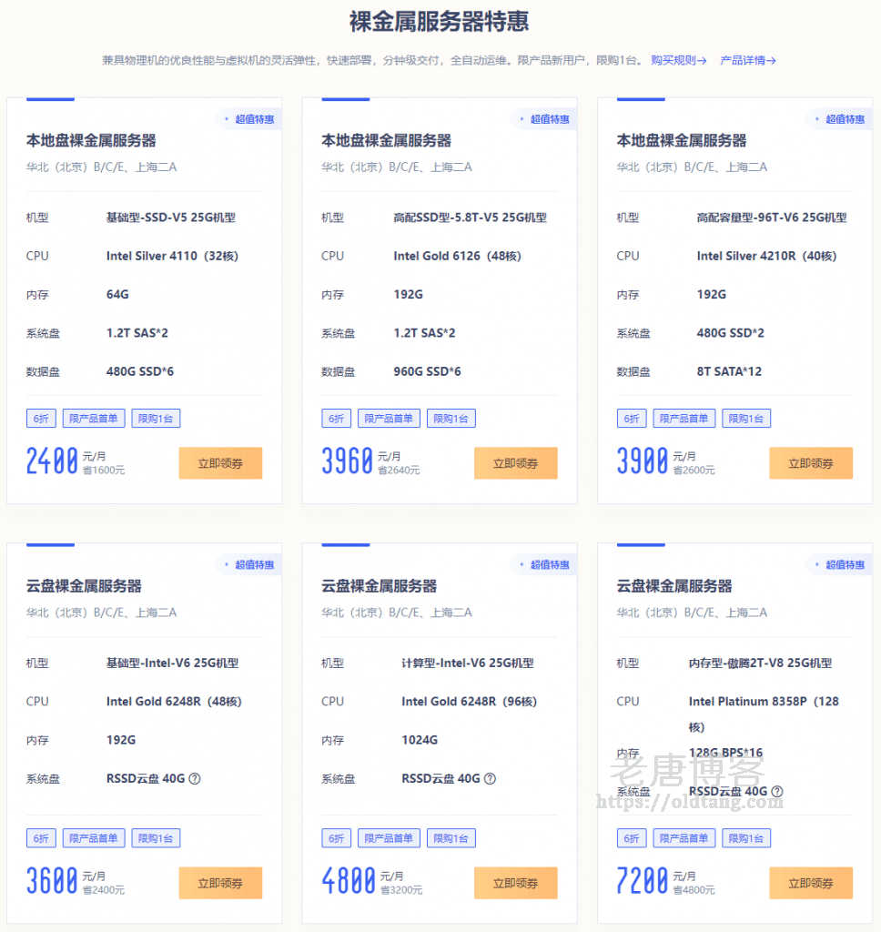 此外还有裸金属服务器,相当于物理机,但又不是物理机,总之性能是完全独立的,也有优惠活动(点击直达)。
