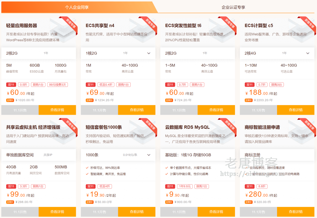 阿里云双十一优惠来了,2核 2G 的配置,仅需一年 60 元,需要新用户。此外也有新老用户同享的活动,价格是原价的五折。阿里云的活动都会在 11 月 1 日准时开启,到时候可以参与一下,老唐准备到时候入手几台,因为阿里云老用户价格实在太贵了,只能等双十一这种优惠的时候买几台先用着。