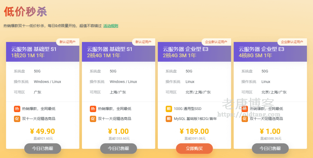 然后我们可以看到新用户的低价秒杀活动,第二款套餐只要 1 块钱就可以买 1 年,这个力度超值。其他的秒杀套餐也都不贵,都可以参加一下。(点击前往秒杀)
