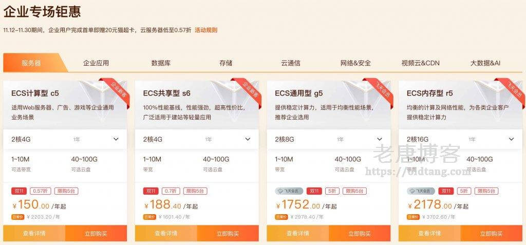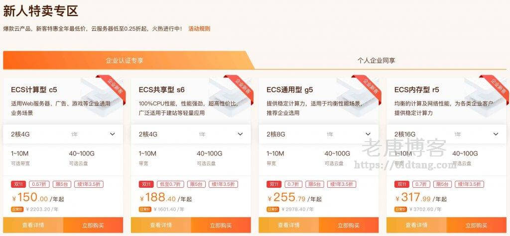 如果我们是企业用户,目前购买是比较便宜的,最低只要 150 元/年,可以买到 2核 4G ECS 计算型云服务器。(点击购买)