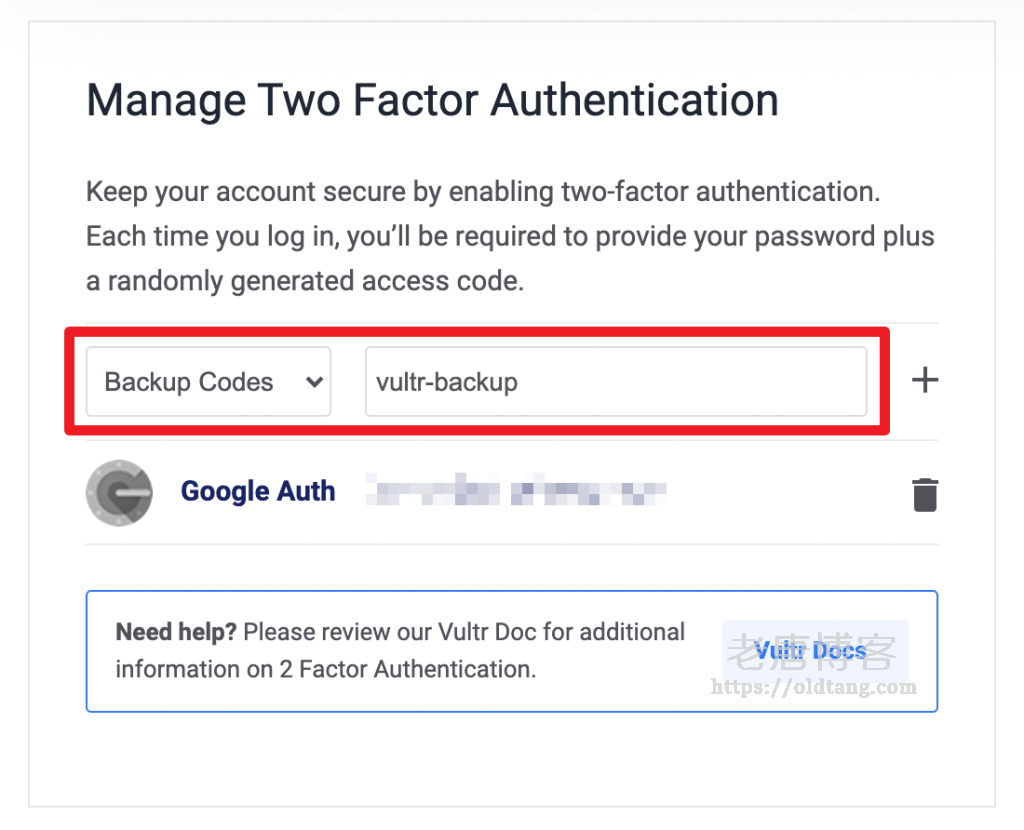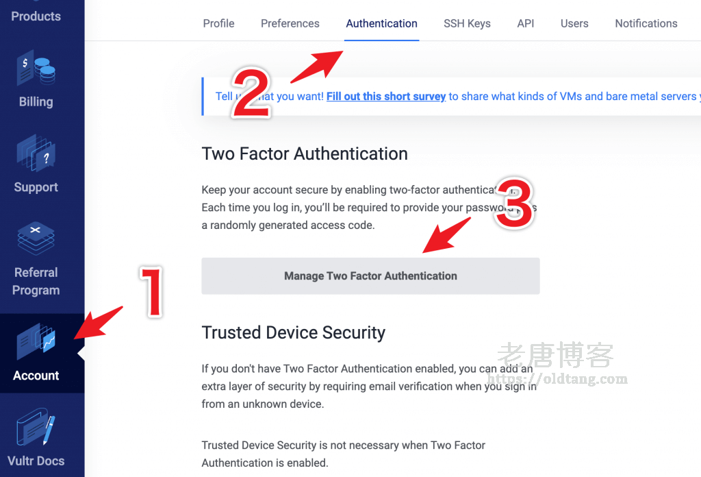 进入 Vultr 官网之后,依次点击 Account -> Authentication -> Manage Two Factor Authentication,即可进入两步验证管理界面。