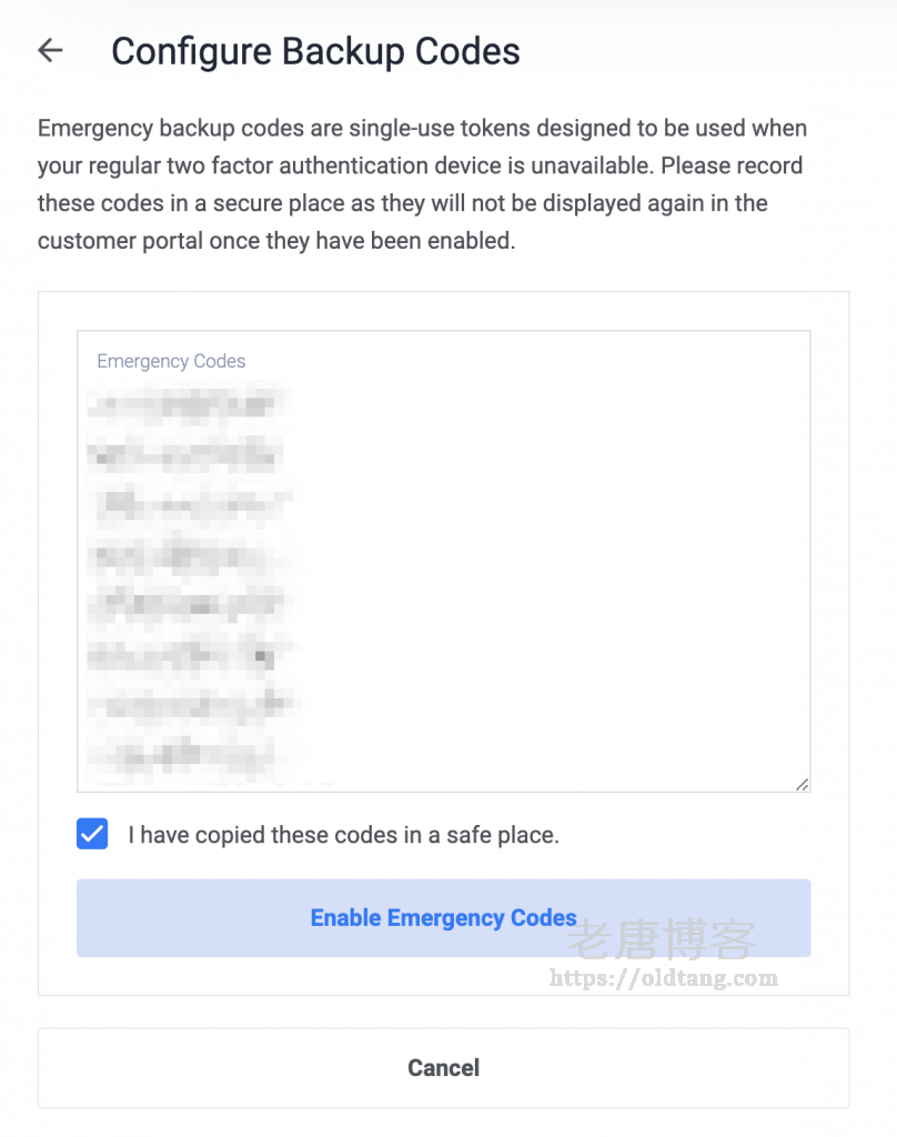 之后,我们需要把这些个备用验证码记录到安全的地方,请务必记下来保存好,然后勾选后点击 Enable 即可启用。