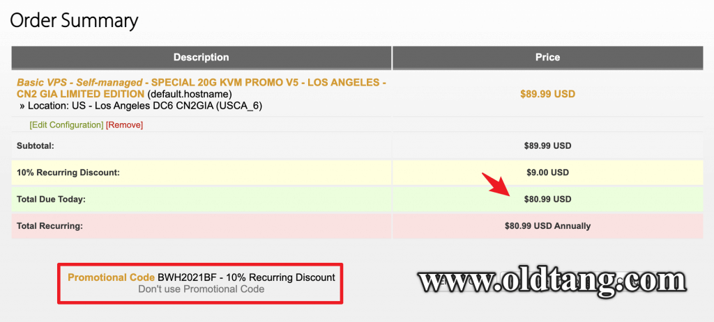 使用搬瓦工黑五优惠码之后仅需 $80.99/年,如下图所示。