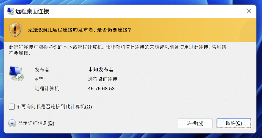 我是下载了这个 .rdp 文件,然后点击之后就会跳出远程桌面连接,非常好用,如图所示。