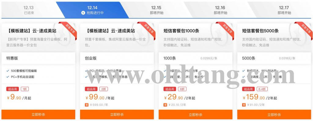 然后可以看到每天有抢购活动,好像每天的活动内容还都是一样的,包括 99 元/年的模板建站。(前往购买)
