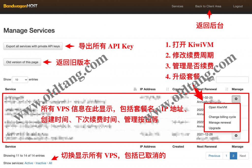 进入上面的最新搬瓦工官网地址之后,点击菜单栏的 Services -> My Services 即可看到下面的最新页面。如下图所示,主要功能已经进行了标注说明。
