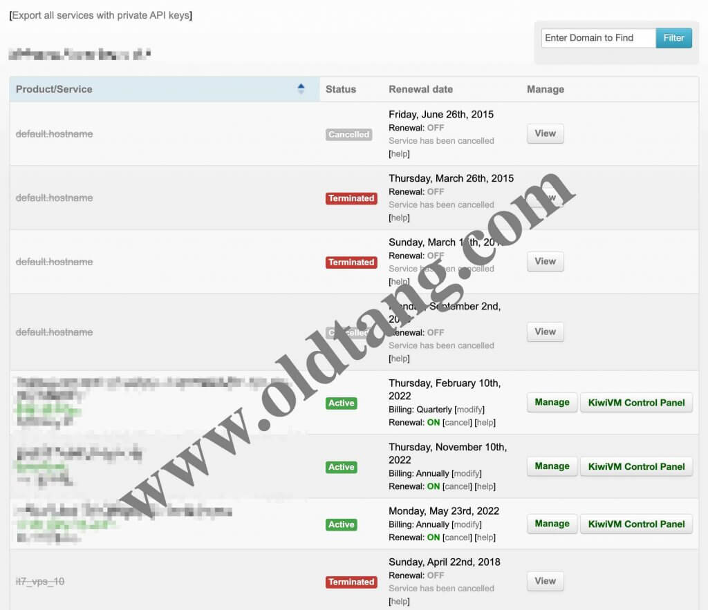作为对比,我们可以看一下旧版的所有 VPS 主机页面是什么样子的,如下图所示,主要区别一个是界面美观程度,一个是不能根据 VPS 状态筛选显示 VPS 主机。