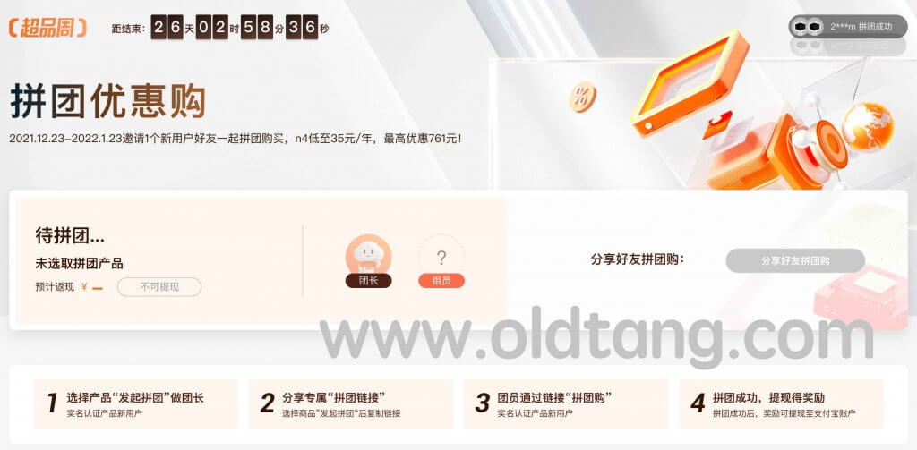 *团长需为阿里云产品新用户,如团长在开团前以产生过付费(老用户)也可正常开团要邀请拼团,但是拼团成功后团长无法获得拼团返现差价。