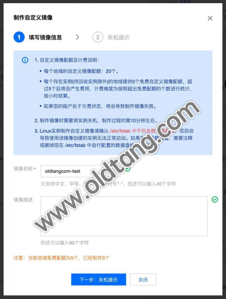 - 制作镜像时需要将实例关机,制作过程约需10分钟左右。