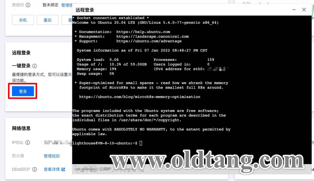 下面要介绍的一键登录功能就是通过 lighthouse 这个账户进行登录,如下图所示,如果我们在腾讯云官网后台点击一键登录的登录按钮,就会跳出一个在线的 SSH 对话框,使用的账户就是 lighthouse。