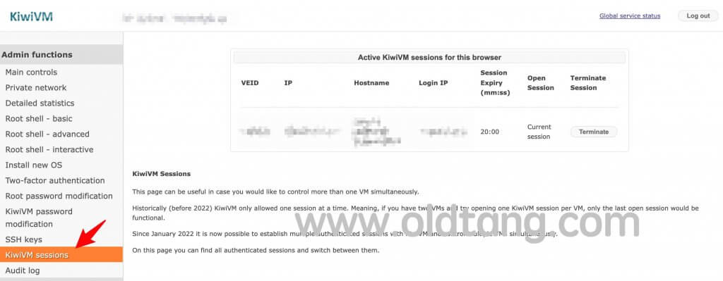 上图主要会显示 VPS 的 VEID、IP 地址、Hostname 主机名、Login IP 登录 IP 地址、Session Expiry 会话过期时间、打开的对话、终止对话等功能。