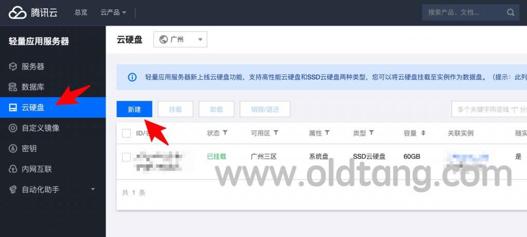 如图所示,在轻量应用服务器管理页面,左侧菜单点击云硬盘之后,就可以看到新建按钮。