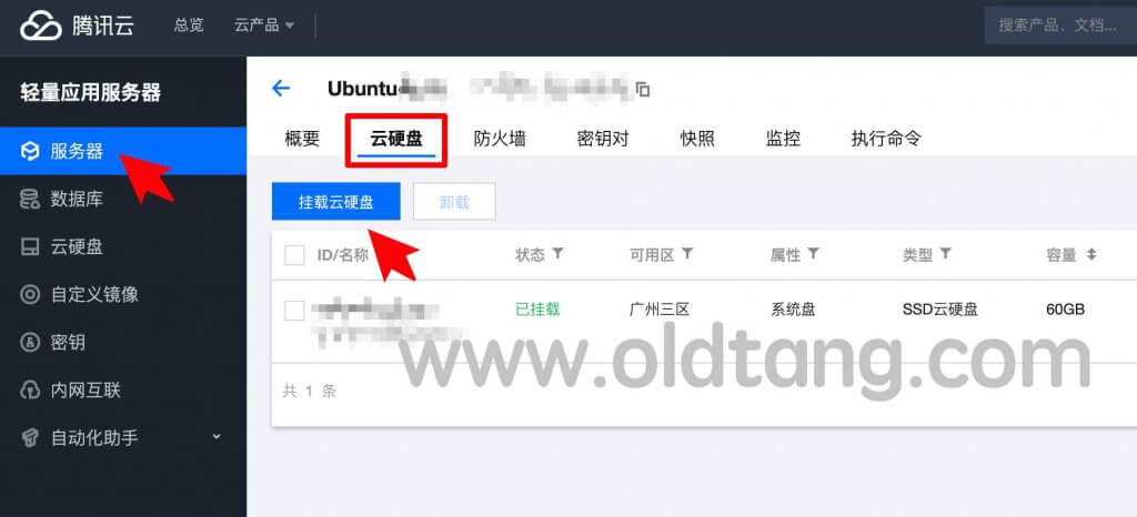 购买之后需要挂载,挂载也很简单,如下图所示,在轻量应用服务器管理页面,切换到云硬盘标签页,即可进行挂载。