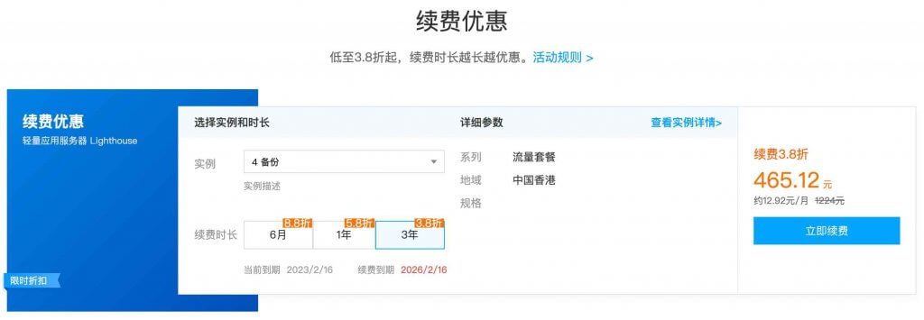还有一个就是续费优惠,如下所示,续费三年可以享受 3.8 折优惠,之前最大力度是 8.5 折,不知道为什么一下子折扣力度差这么多。反正就是便宜就对了,买买买。