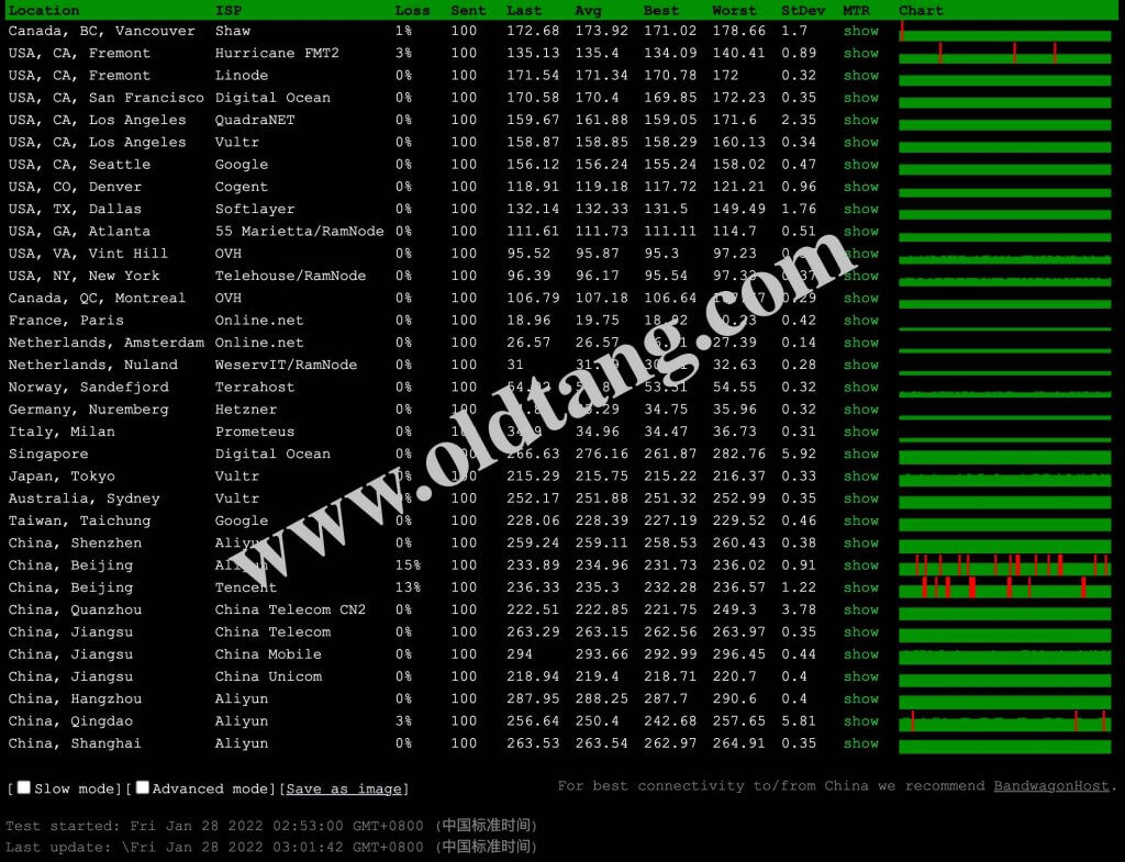 Vultr 西班牙马德里机房的丢包率居然惊人的好,到国内只有到北京的两个线路丢包比较严重,其他线路几乎全都是 0 丢包。