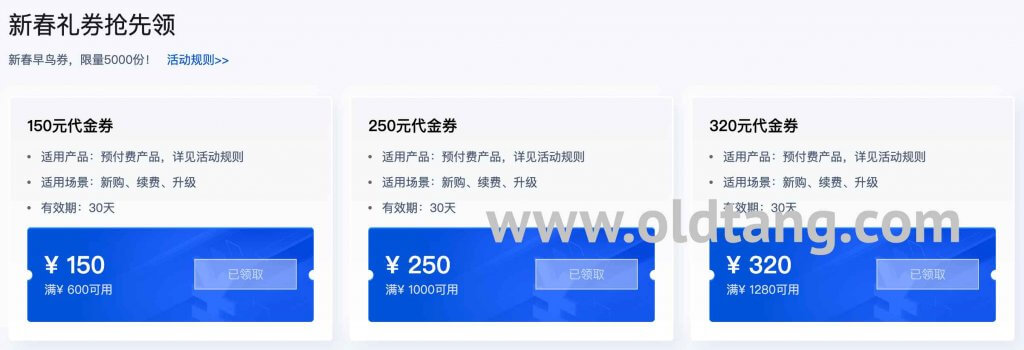 腾讯云 2022 新春优惠抢先看活动预告有所更新,放了三张早鸟代金券,分别是满 600 减 150、满 1000 减 250、以及满 1280 减 320,加起来总共 720 元代金券大礼包,使用门槛不算高。说是限量 5000 份,反正目前还能领,大家抓紧,争做前 5000 人。这个代金券针对预付费产品的新购、续费、升级都可以使用,也就是可以用在云服务器(包括 CVM 和轻量应用服务器)、云数据库等各种云产品。